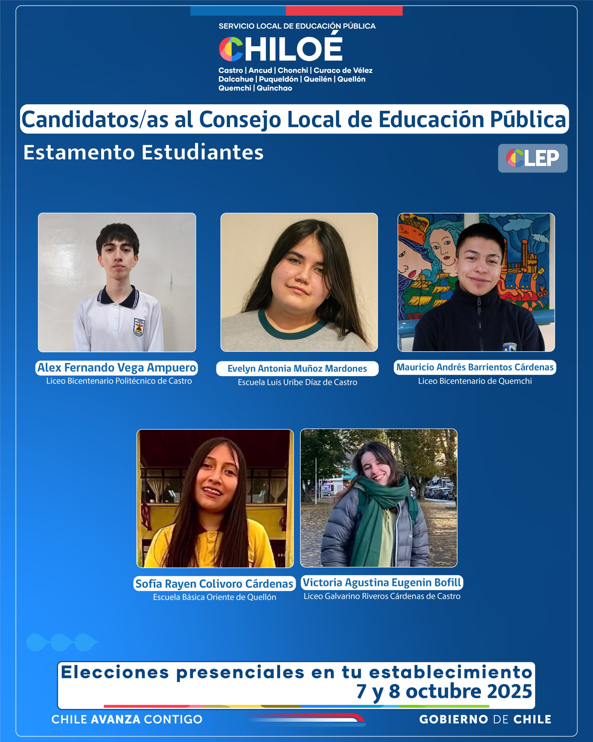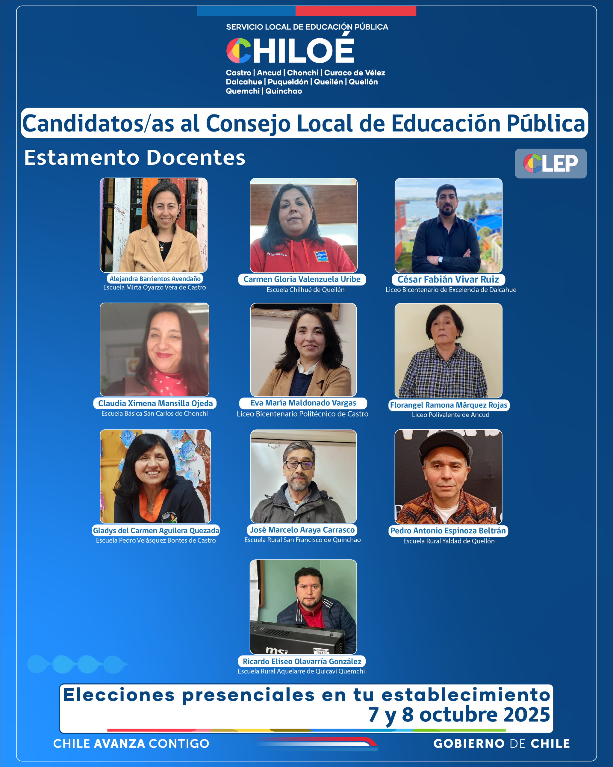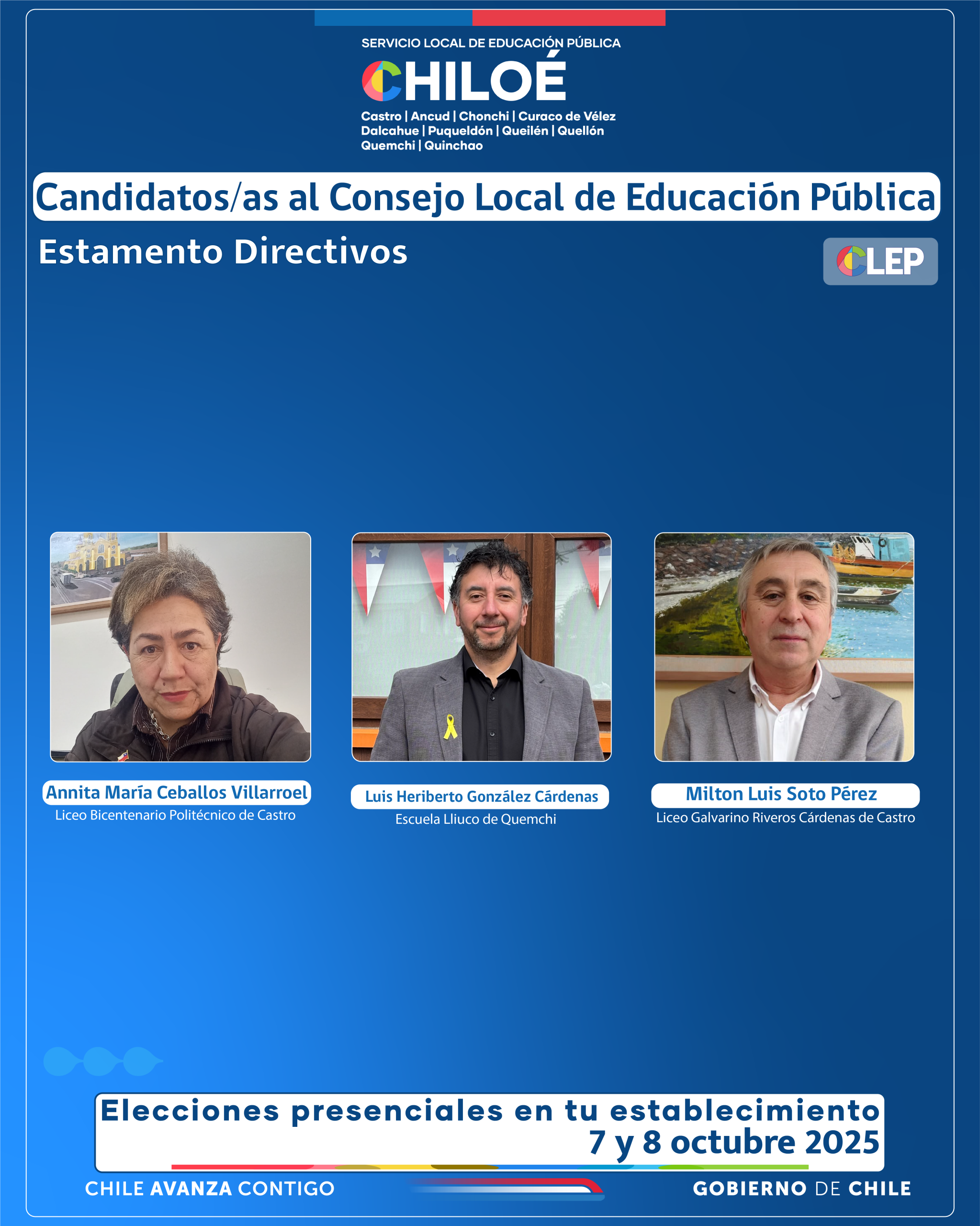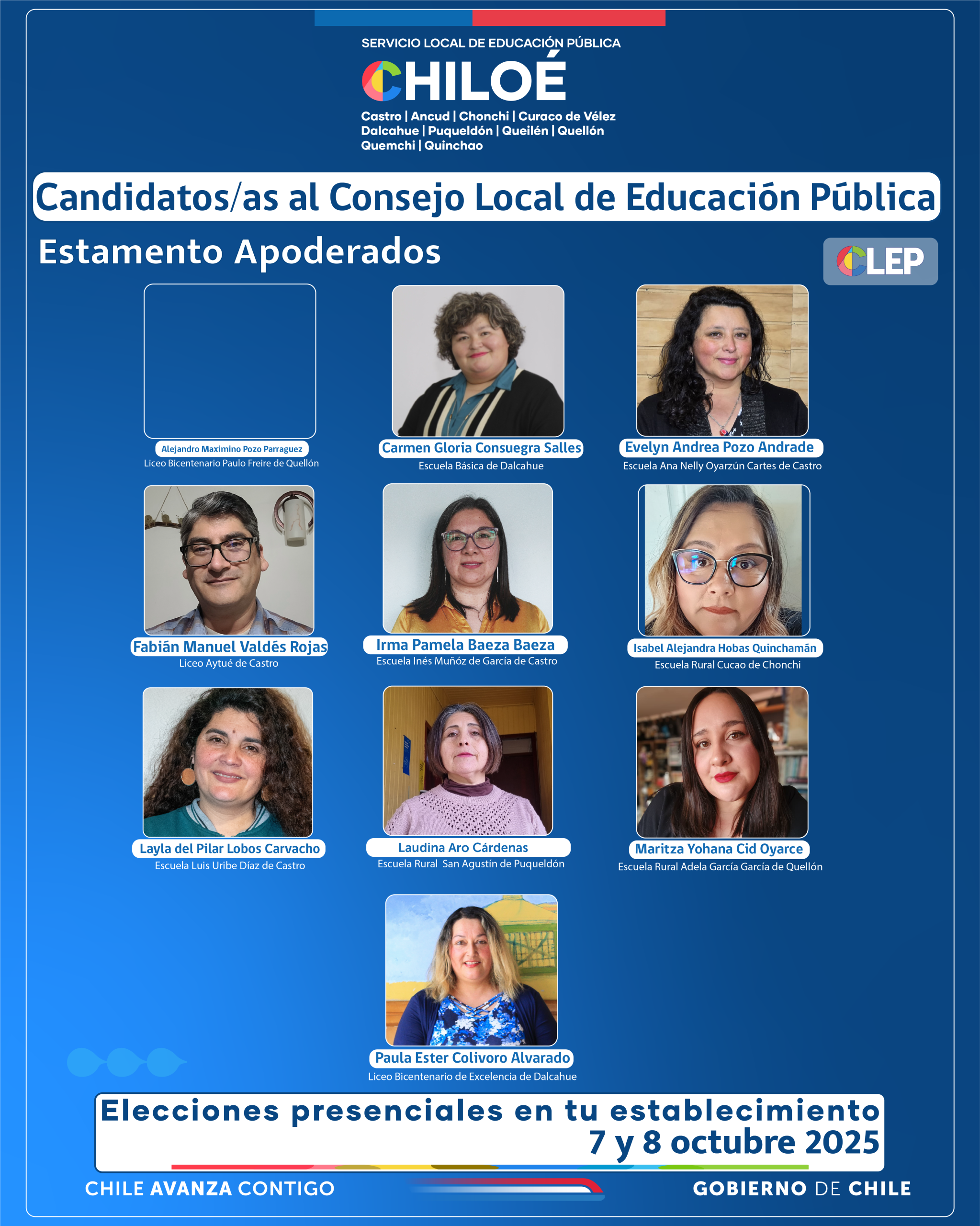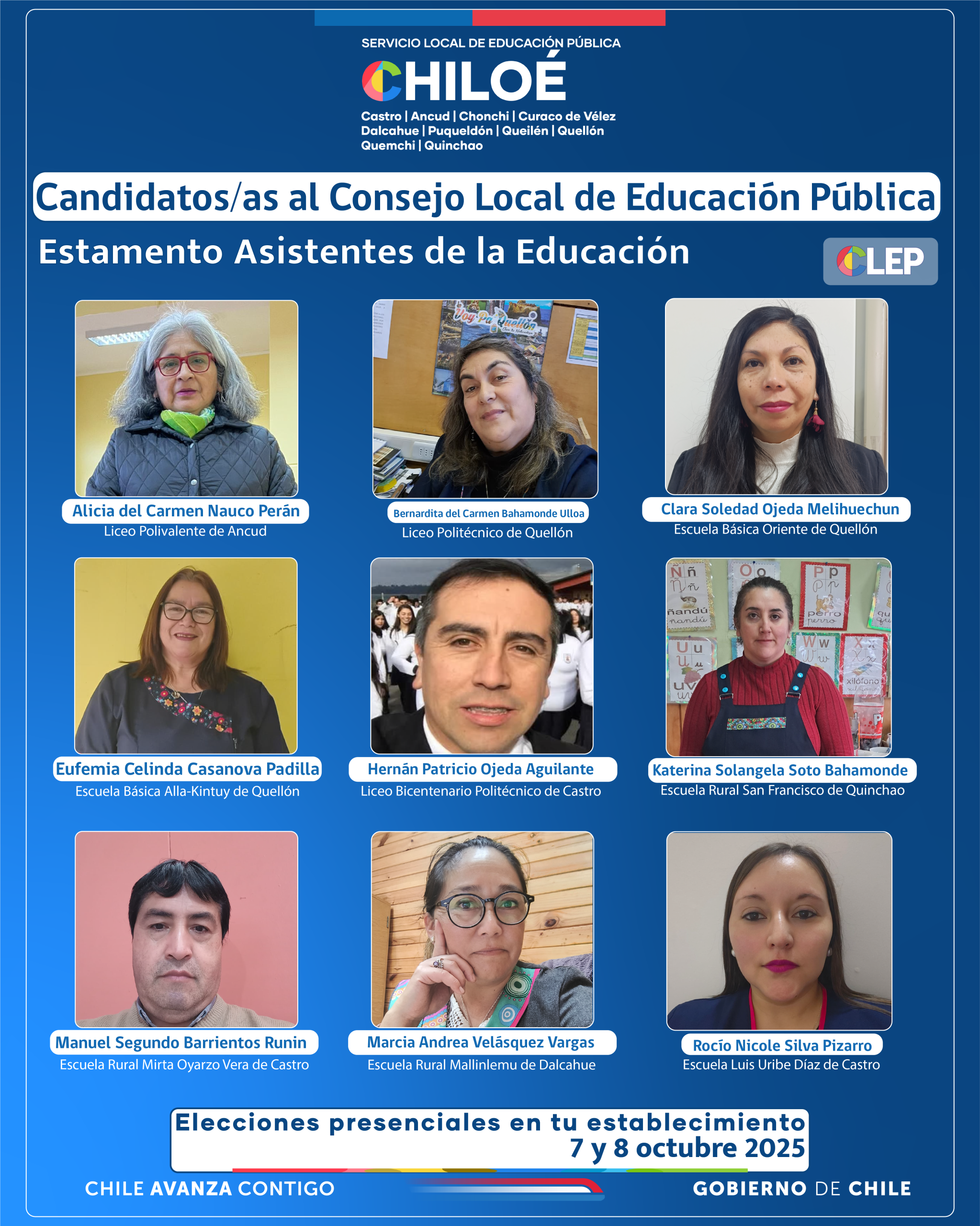 Compartimos afiches enviados por el SLEP Chiloé, con la información de los candidatos por estamento al CLEP, Consejo Local de Educación Pública.